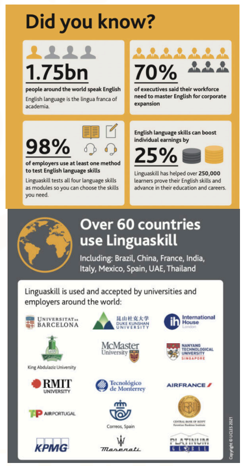 Chứng chỉ Linguaskill được công nhận toàn cầu bởi hơn 25.000 trường đại học, cơ quan và tổ chức chính phủ, với mạng lưới gồm hơn 2.800 trung tâm khảo thí và 50.000 trường học tại hơn 130 quốc gia trên thế giới.