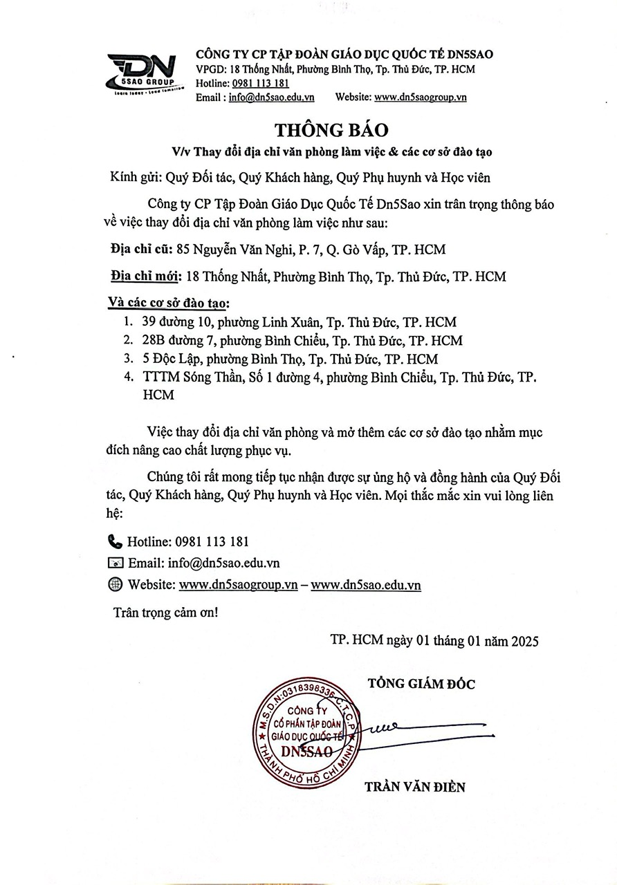 ![]() | CÔNG TY CP TẬP ĐOÀN GIÁO DỤC QUỐC TẾ DN5SAO VPGD: 18 Thống Nhất, Phường BìnhThọ, Tp. Thủ Đức, TP. HCM Hotline: 0981 113 181 Email : info@dn5sao.edu.vn Website: www.dn5saogroup.vn |
