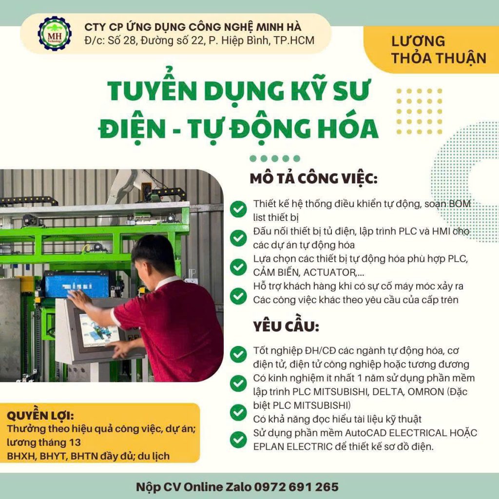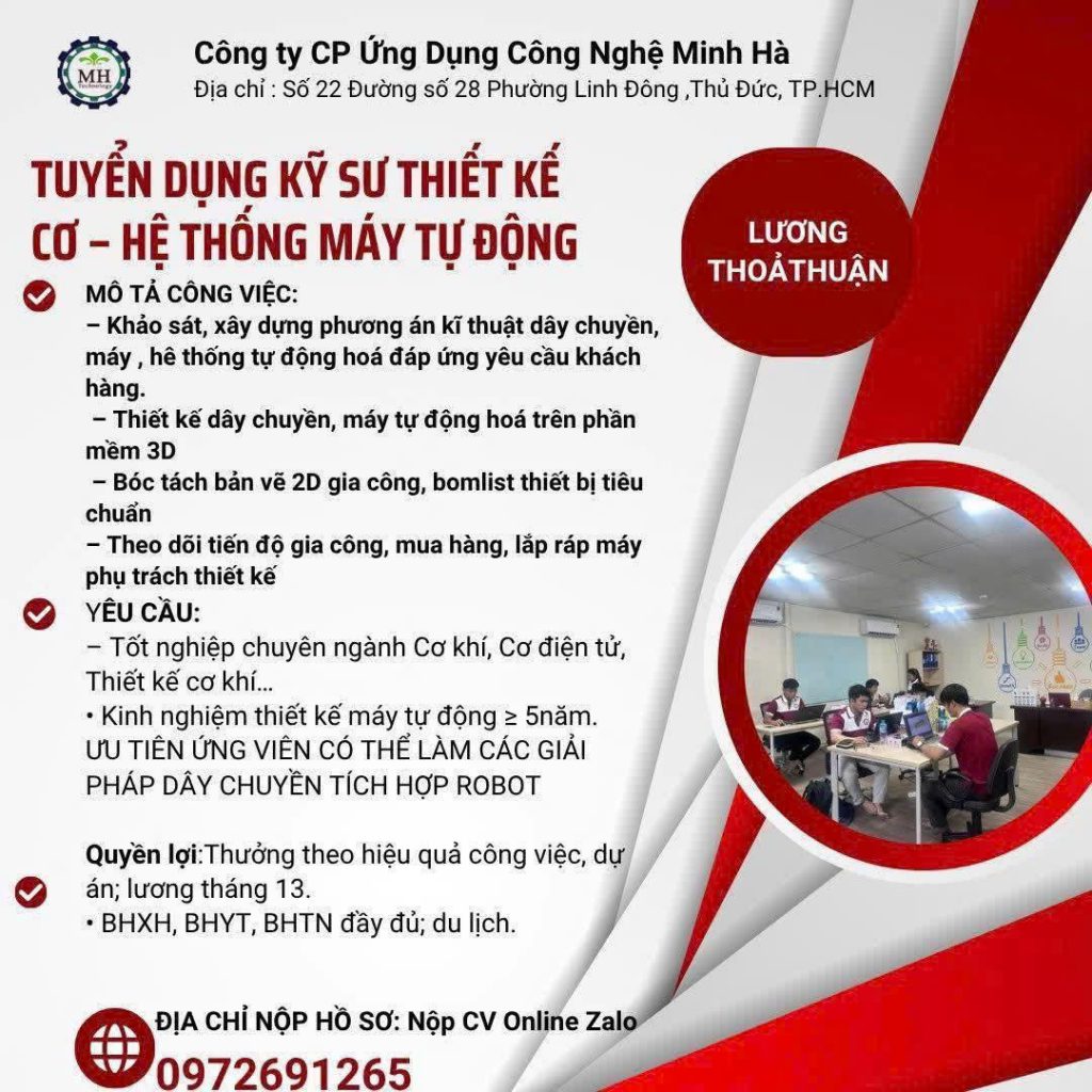 Giới Thiệu Việc LàmTuyển dụng Kỹ sư Cơ khí & Kỹ sư Điện – Tự động hóa tại Minh Hà (Thủ Đức, HCM) Đăng ngày 18 Tháng 8, 202518 Tháng 8, 2025 bởi admin[HCM-THỦ ĐỨC-ƯU TIÊN ĐI LÀM ĐƯỢC NGAY] Công ty cổ phần Ứng dụng Công nghệ Minh Hà tuyển dụng 2 vị trí.ƯU TIÊN ỨNG VIÊN CÓ THỂ LÀM CÁC GIẢI PHÁP DÂY CHUYỀN TÍCH HỢP ROBOT ĐỊA CHỈ NỘP HỒ SƠ: Nộp CV Online Zalo: 0972691265 # Bài viết liên quan VinFast Sài Gòn QL13 Tuyển Dụng Nhân Sự Dịch Vụ – Lương Hấp Dẫn Tuyển Trợ Giảng Tiếng Anh Part-time – Lương Từ 25K/h – Ưu Tiên Sinh Viên, Không Yêu Cầu Kinh Nghiệm VINFAST NEXTGEN 2025 – Cơ Hội Cho Kỹ Sư Trẻ Việt Nam Vươn Tầm Thế Giới Tuyển Kỹ Thuật Viên Bảo Trì – Công ty Phúc Sang Minh (Đồng Nai)[TUYỂN DỤNG] NHÂN VIÊN VĂN PHÒNG – LÀM VIỆC TẠI THỦ ĐỨC