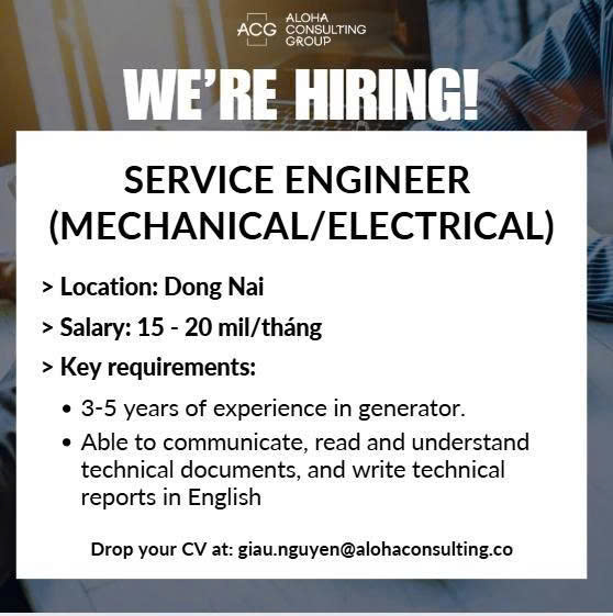 Tuyển dụng Service Engineer (Cơ khí/Điện) – Thu nhập 15–20 triệu tại Đồng Nai
