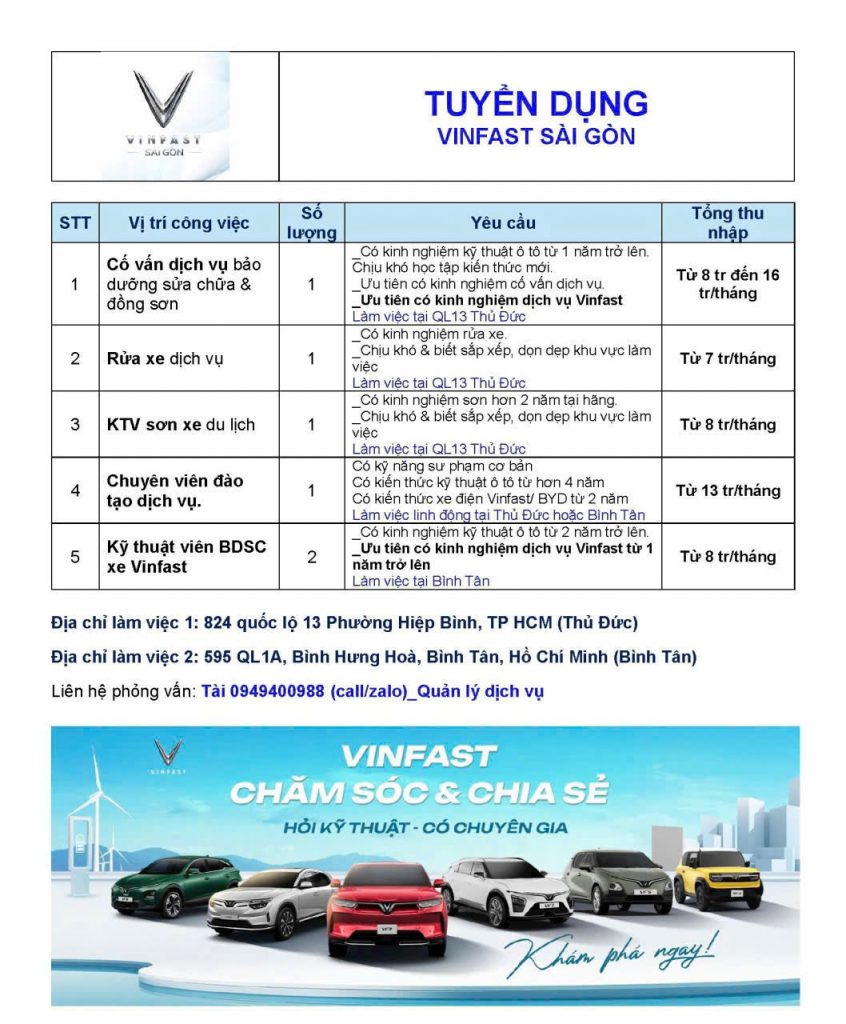 Vinfast Sài Gòn gồm 2 xưởng dịch vụ, đang tuyển dụng bổ sung thêm. Anh em mình có nhu cầu việc làm hãy liên hệ theo thông tin bên dưới.